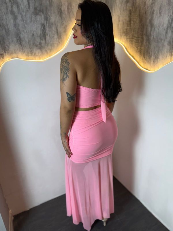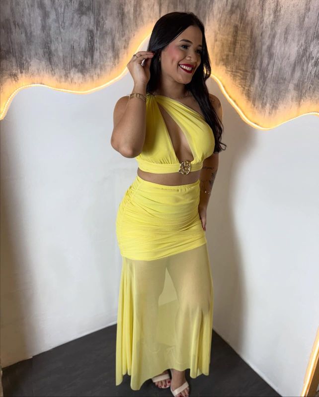Caimento Fluido: A saia longa e fluída apresenta uma transparência sutil da metade das coxas para baixo, criando um efeito "esvoaçante" e alongado que adiciona movimento e um toque sensual sem ser excessivo.