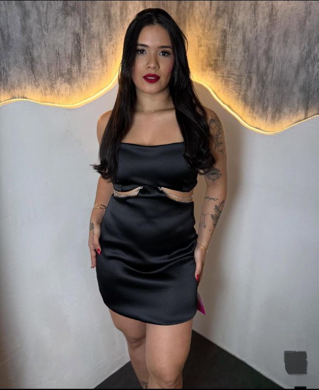Recortes Estratégicos: O design cut-out na cintura, unindo o top à saia, cria a ilusão de um conjunto, afina a silhueta e confere um toque sensual.