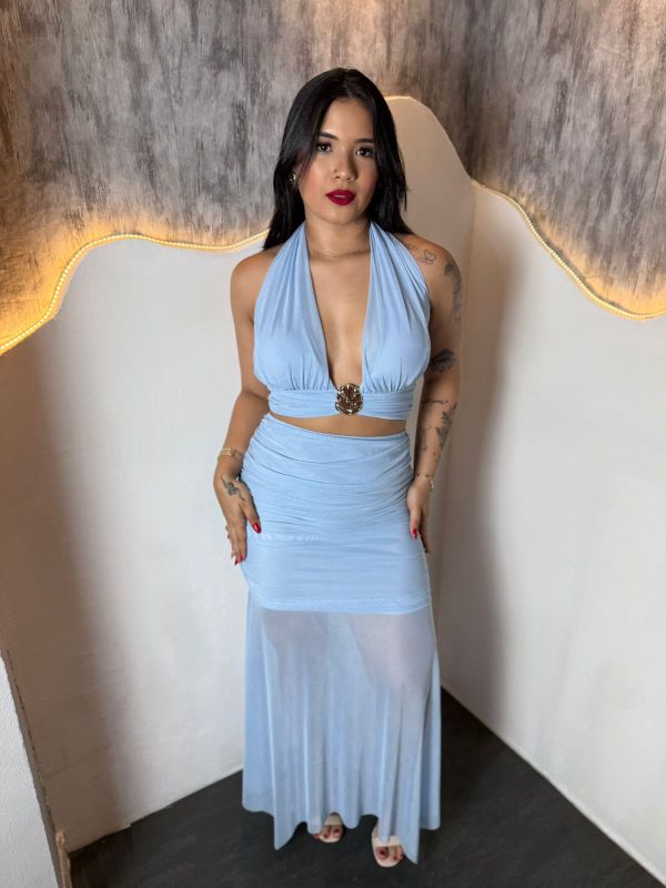 Caimento Fluido: A saia longa e fluída apresenta uma transparência sutil da metade das coxas para baixo, criando um efeito "esvoaçante" e alongado que adiciona movimento e um toque sensual sem ser excessivo.